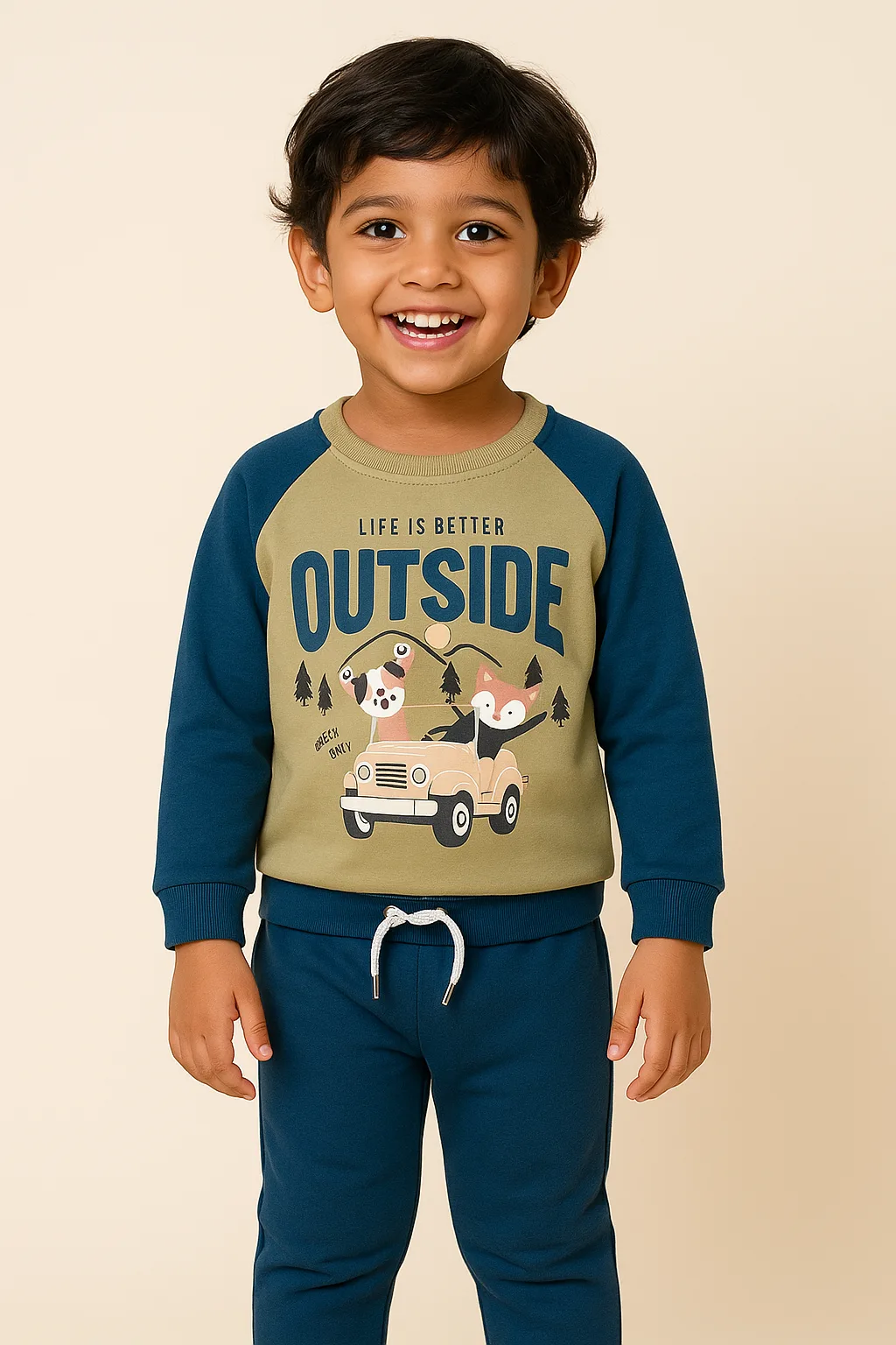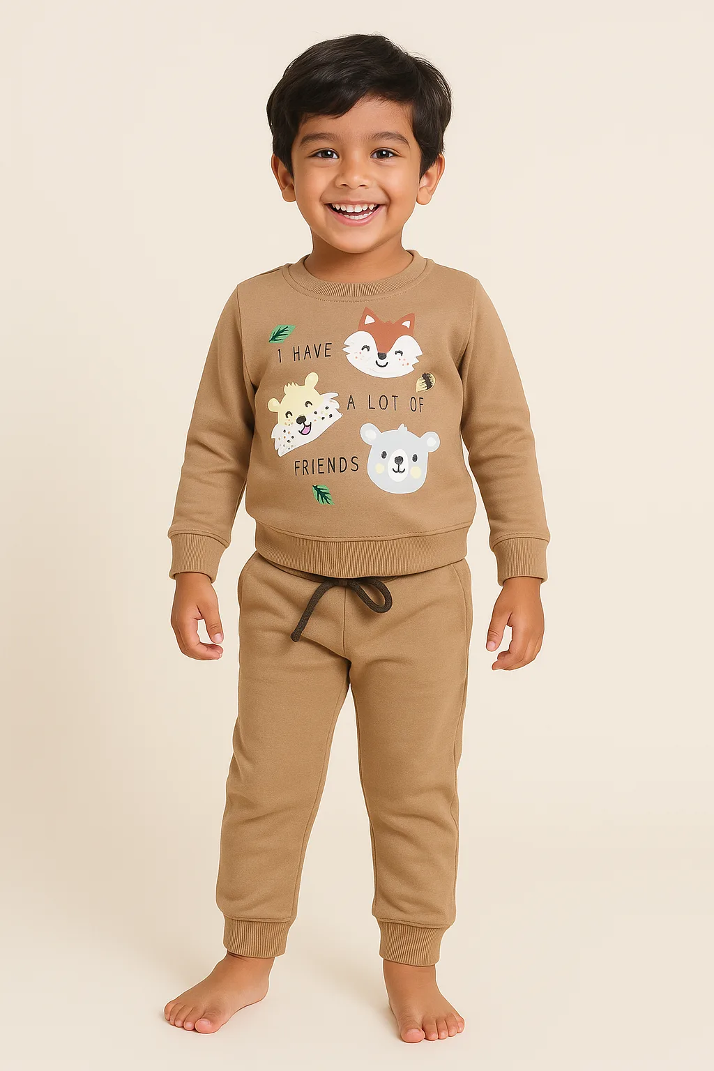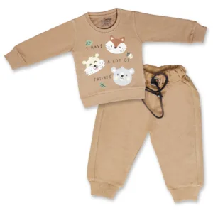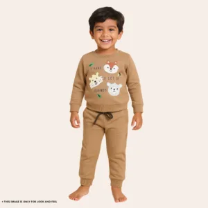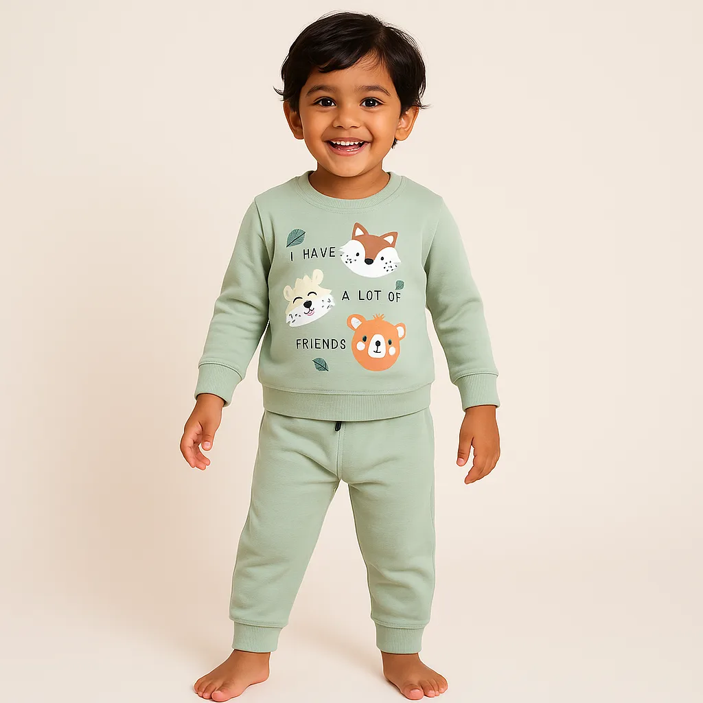 Joy Kids Baby Boy Winter Two-Piece Set – Soft Fleece Co‑Ord, Cute Animal Print, Full Sleeves, Ribbed Cuffs, Drawstring Waist