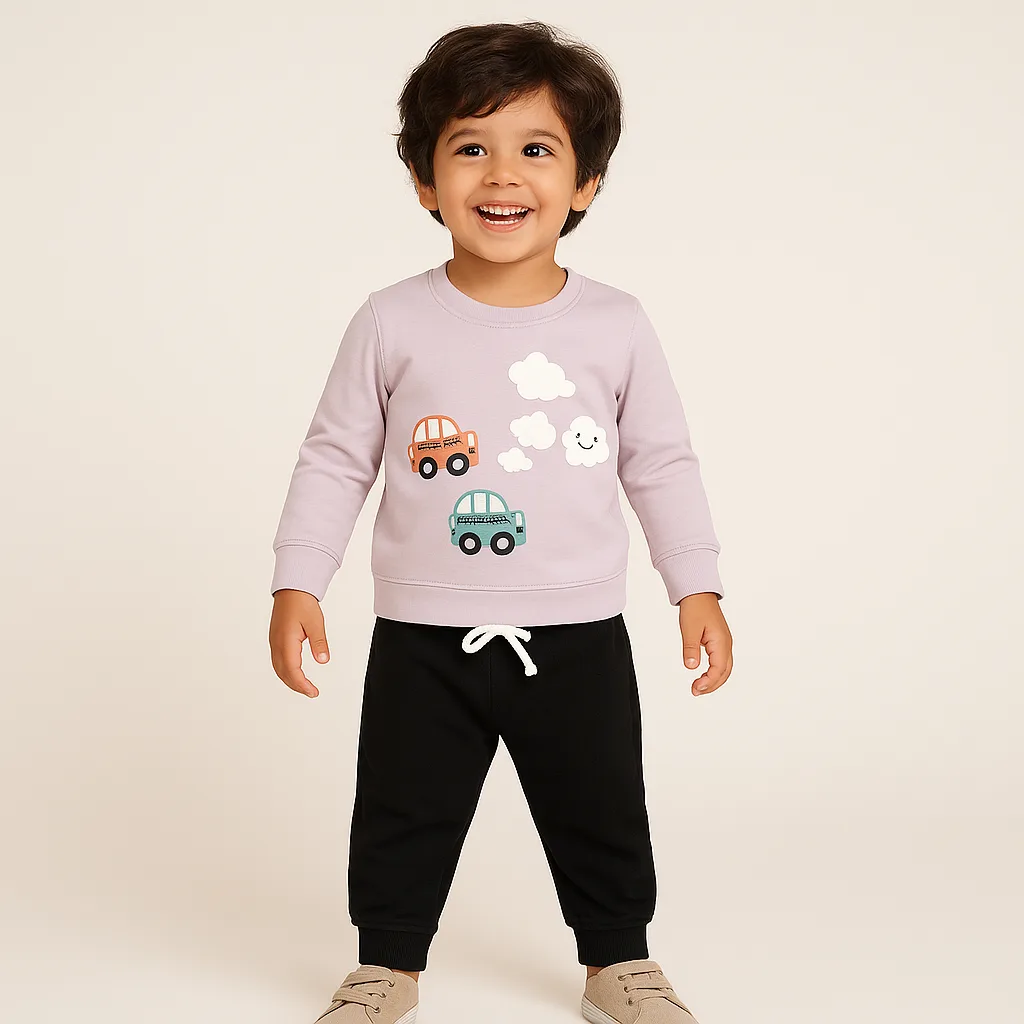 Joy Kids Boys Two-Piece Cotton Fleece Set, Car Print Top & Black Bottoms, Cozy Winter Co-ord Outfit
